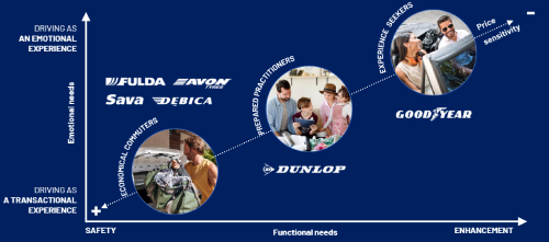 Goodyear je definirao jasne uloge za svoje marke kako bi se obratio različitim profilima potrošača kako bi ponudio svoj najkonkurentniji portfelj vrhunskih, pristupačnih i jeftinih marki koje mogu zadovoljiti potrebe bilo koje vrste potrošača na tržištu u razvoju.