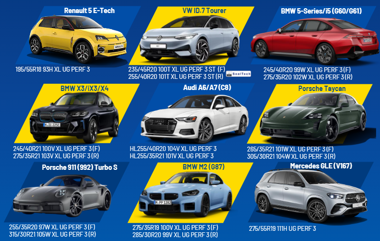 90 % novih dimenzij UG PERFORMANCE 3 je enakih ali večjih od 19”. Pnevmatike ustezajo za najnoveša vozila na trgu, med njimi tudi za električna, kot tudi za starejša najbolj priljubljena vozila.